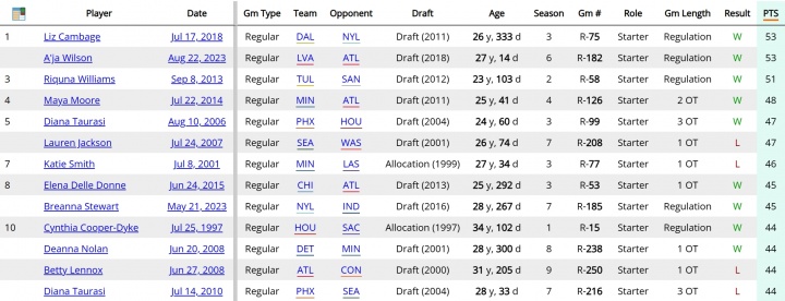 此外, 44分还排在WNBA历史单场得分榜的并列第10位。