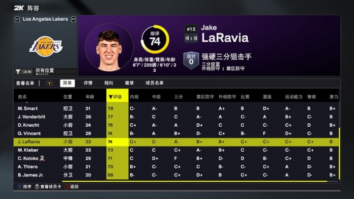 08月30日讯 NBA2K26各队球员能力值出炉,其中湖人详情如下: