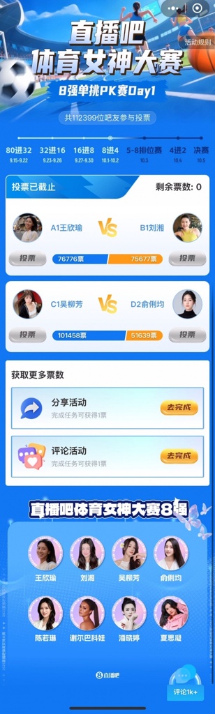 直播吧女神大赛8强赛Day1赛果:王欣瑜险胜刘湘 吴柳芳淘汰俞俐均