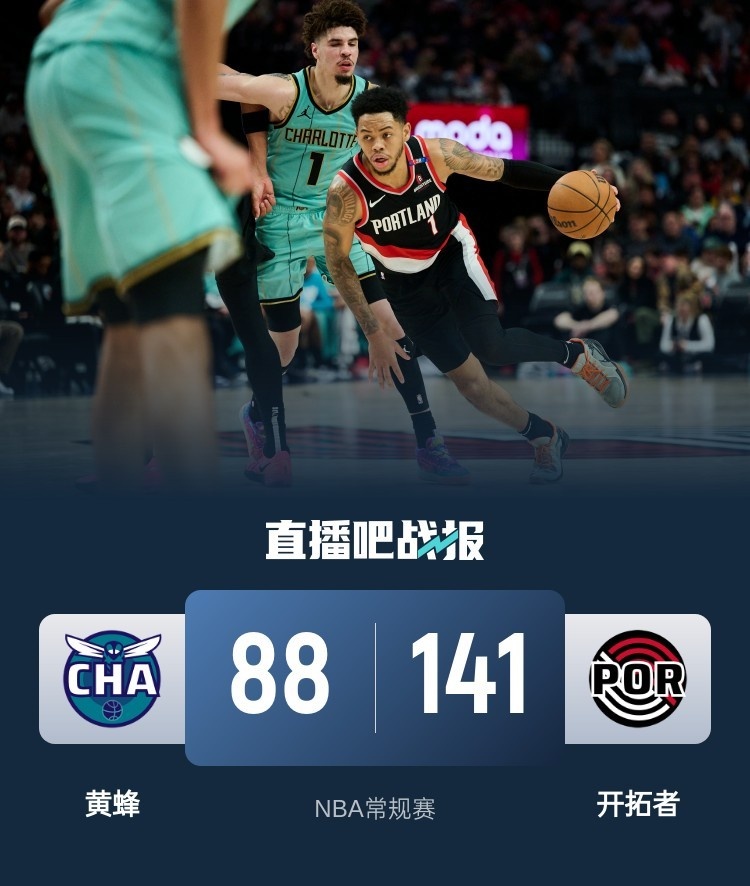 开场没多久开拓者就在阿夫迪亚的带领下打出一波13-0的攻势建立领先,虽然黄蜂两记三分止血,但开拓者再度打出冲击力又将比分拉开,开拓者的外线也逐渐找到手感连中三分。第二节黄蜂进攻依旧打得不理想,鲍尔手感不佳,反观西蒙斯状态火热单节轰下15分帮助开拓者继续扩大优势,半场过后开拓者领先33分。易边再战,鲍尔的表现依旧不佳,开拓者则是全面开花将分差继续拉大,比赛彻底失去悬念,末节成为两队练兵时间,最终开拓者141-88血洗黄蜂结束4连败,黄蜂遭遇2连败了。