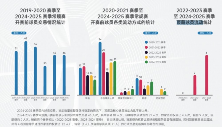 配签约2人次。较前两个赛季相比(2022-2023赛季、2023-2024赛季),自由球员认领、独家签约权转让及球员租借的数量有所增加,同时顶薪球员流动增加,共有4名顶薪球员通过独家签约权转让(2人)、转会(1人)及自由球员认领(1人)的方式交易到新俱乐部并签约顶薪。