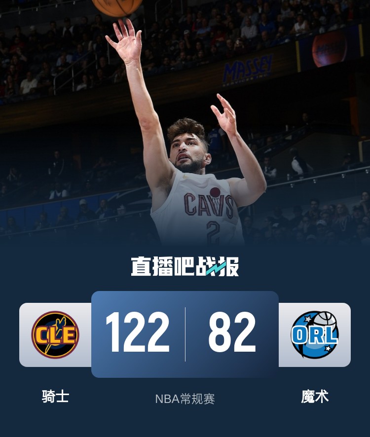 比赛开始,斯特鲁斯和亨特联手轰进5记三分带队取得两位数优势,魔术全队慢热,骑士持续发力不断扩大优势,次节分差拉开到20分以上,科尔-安东尼和班凯罗联手拿分帮助魔术苦苦支撑,半场战罢骑士57-43领先魔术。易边再战,骑士火力全,再度将分差拉开到20分以上,末节骑士一鼓作气将优势扩大到30分以上,魔术换下主力投子认负。最终,骑士122-82客场大胜魔术,豪取8连胜。