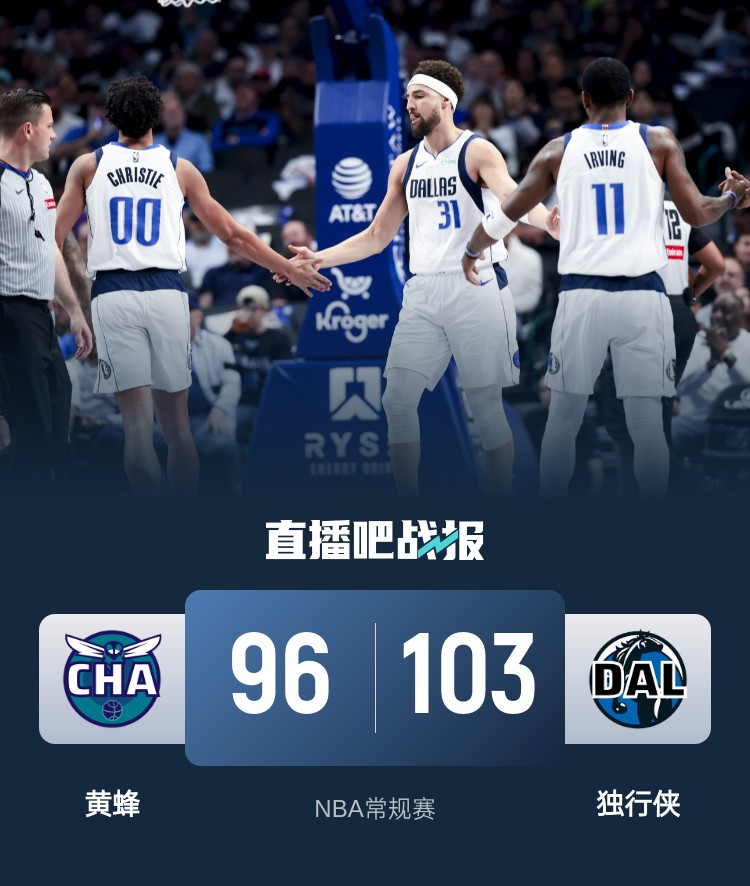 开场后独行侠10天合同中锋摩西-布朗和新星克里斯蒂表现活跃帮助独行侠取得领先,黄蜂依靠内线进攻追赶比分,在第一节末和第二节初期黄蜂打出一波14-0的攻势完成反超,摩西-布朗再度站出来,他连续打进帮助独行侠稳住局面。易边再战,马威内线接连砍分帮助黄蜂再度反超,随后欧文和埃克萨姆轮番发力帮助独行侠再度建立领先。末节布里奇斯外线两记三分带队掀起反扑抹平分差,关键时刻欧文站出来连续拿分,克莱也在外线支援三分,最终独行侠103-96送给黄蜂5连败。