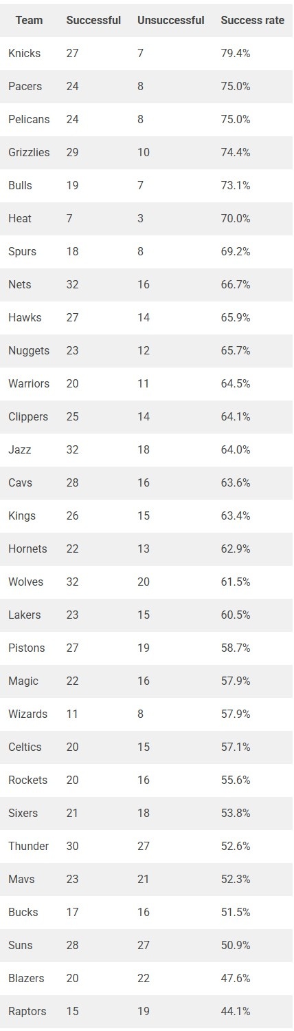 然而,挑战的成功率并不是唯一衡量标准。一些教练虽然成功率较低,但成功推翻的判罚次数更多。这些成功次数多的教练包括篮网主教练费尔南德斯、爵士主教练威尔-哈迪和森林狼主教练克里斯-芬奇,他们三人以成功推翻32次判罚并列联盟第一。