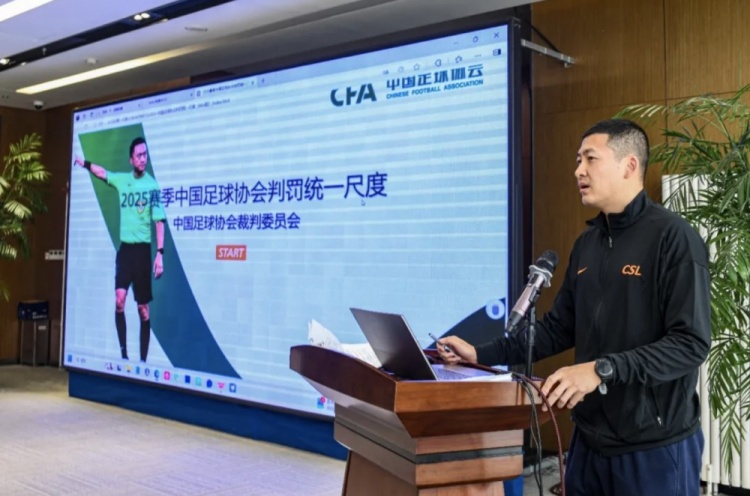 之后,特邀嘉宾、国际级、现役中超联赛裁判员张雷围绕2025赛季职业联赛判罚统一尺度结合实战案例进行了深入细致的宣讲,为全体人员上了一堂生动精彩、丰富详实的规则教育课。
