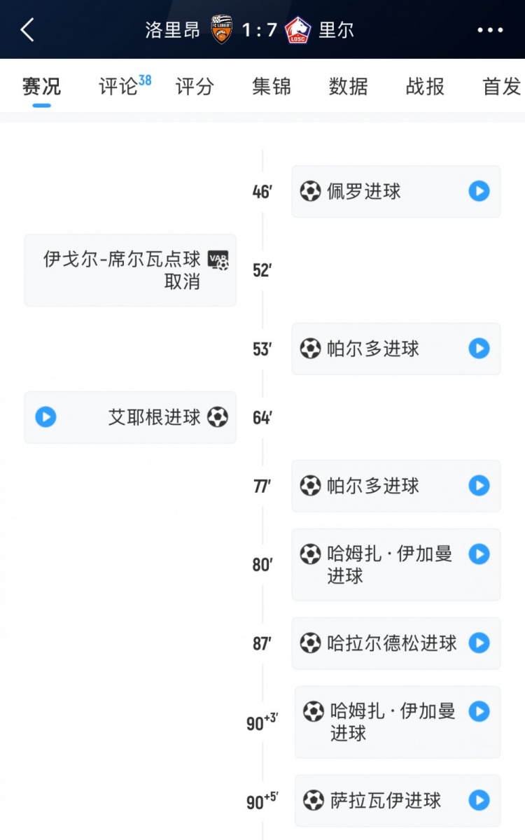 7-1客胜洛里昂&下半场打入全部7球,里尔是法甲自1997年来首队