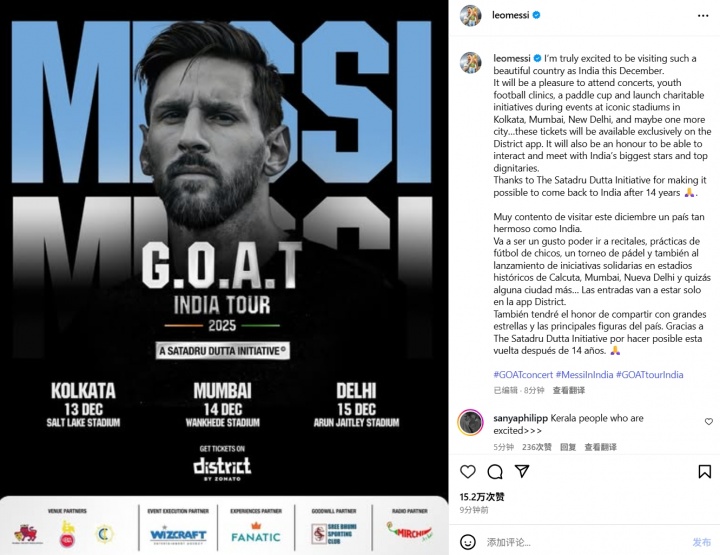 梅西官宣12月印度行:很高兴能访问印度,我将在多个城市参加活动