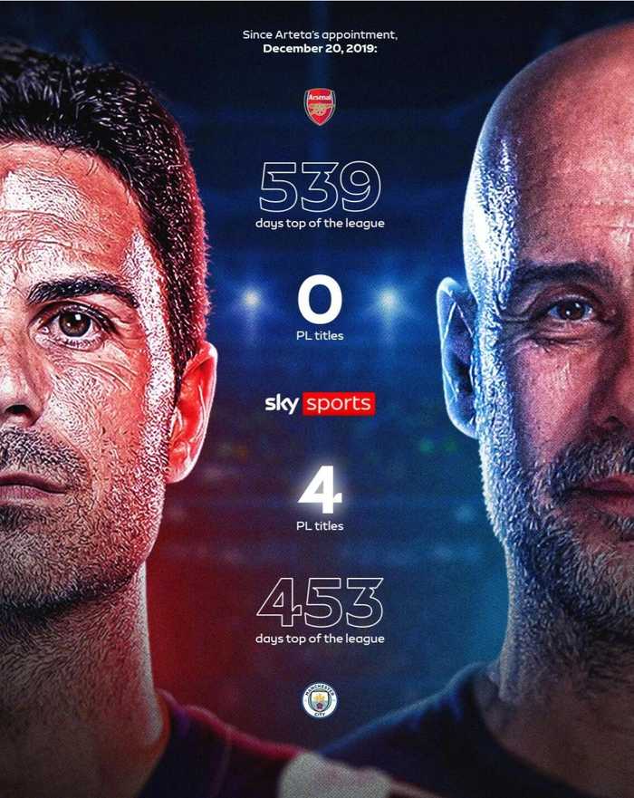 据天空体育的统计,自阿尔特塔执教以来,阿森纳已经539天领跑英超,而瓜迪奥拉的曼城只有453天的时间在榜首,可是在此期间曼城拿了4次英超冠军,阿森纳却颗粒无收。