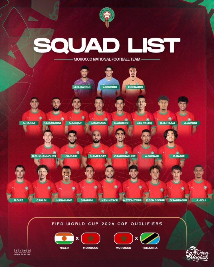 摩洛哥名单:阿什拉夫、马兹拉维、布拉欣-迪亚斯、恩-内斯里在列