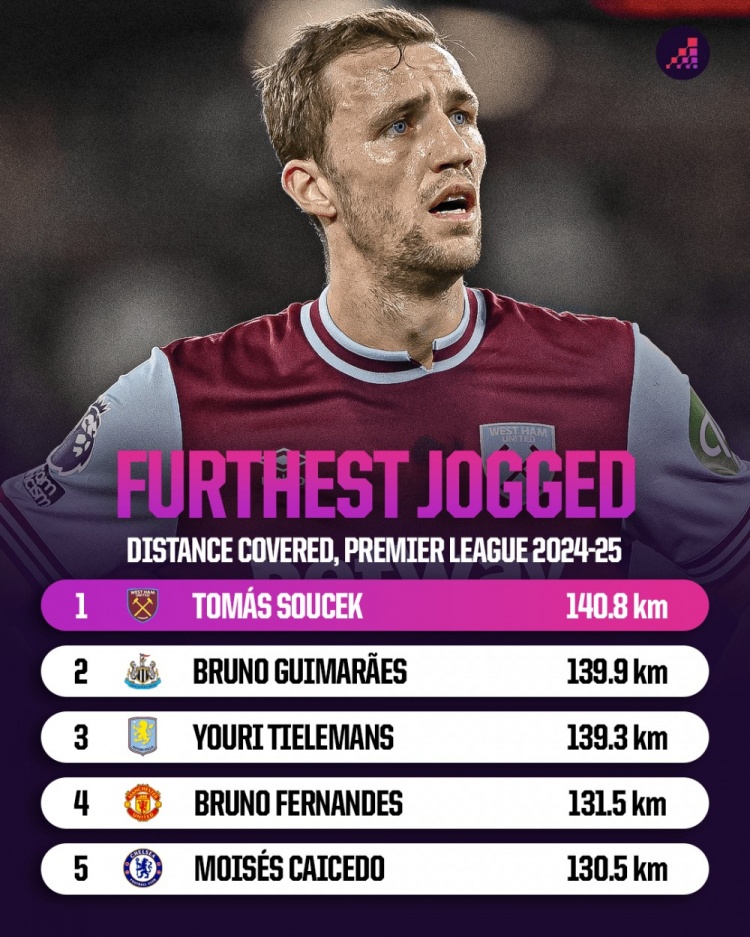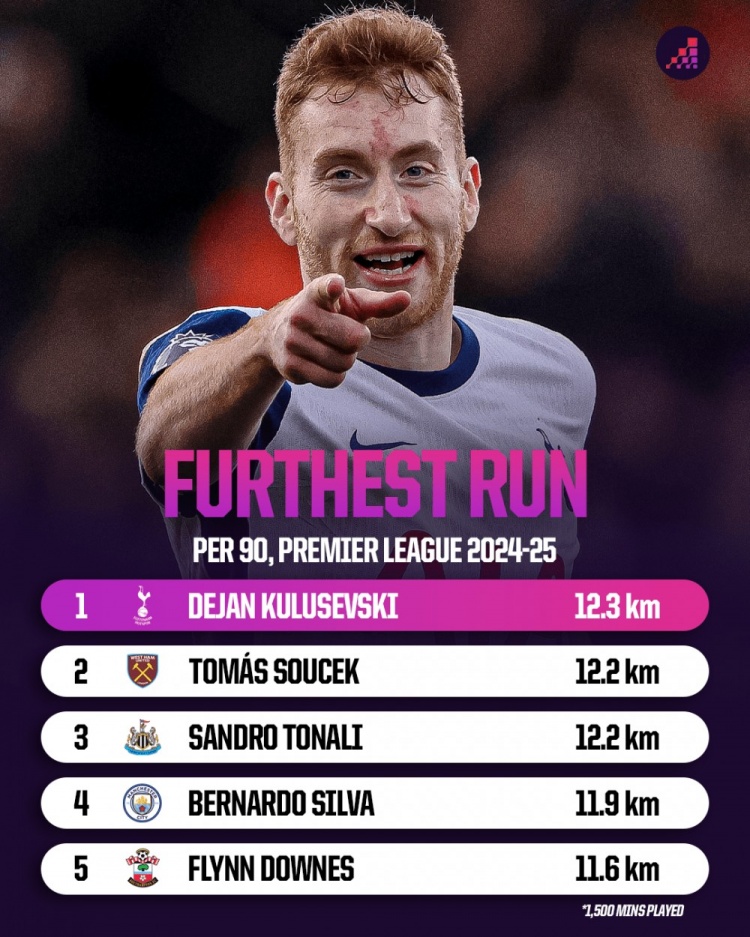 4月1日讯 据Opta统计,库尼亚是本赛季英超散步时间占比最高的球员,库卢塞夫斯基则是每90分钟跑动最多的球员。