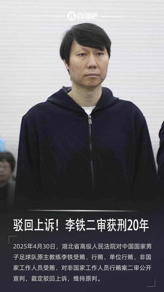 2025年4月30日,湖北省高级人民法院对中国国家男子足球队原主教练李铁受贿、行贿、单位行贿、非国家工作人员受贿、对非国家工作人员行贿案二审公开宣判,裁定驳回上诉,维持原判。