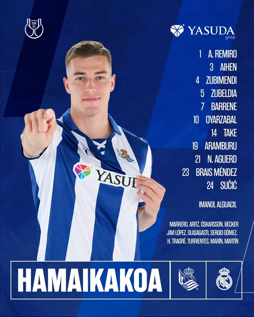 皇家社会首发:1-雷米罗、3-穆尼奥斯、21-阿格尔德、4-祖比门迪、5-祖贝迪亚、23-布莱斯-门德斯、24-苏西奇、7-巴雷内切亚、14-久保建英、10-奥亚萨瓦尔、19-阿兰布鲁