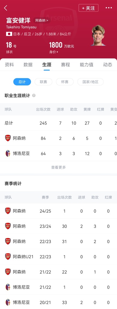 富安健洋2021年以1860万欧的转会费的加盟阿森纳,之后共为枪手出场84次,他与阿森纳原本的合同下赛季才结束,24/25赛季初富安健洋仅出场1次,时长6分钟。