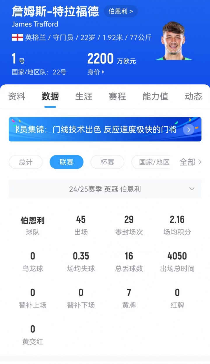 22岁的特拉福德上赛季为伯恩利在英冠出场45次,贡献29场零封。球员目前的身价为2200万欧元,有消息称曼城有意将其回购。