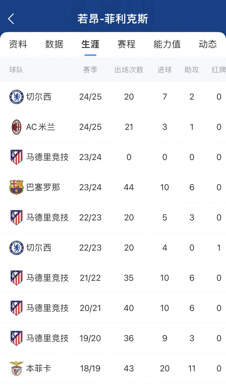 2023年1月,菲利克斯租借加盟切尔西,开启了自己的流浪生涯。两年间菲利克斯先后辗转马竞、巴萨、切尔西、AC米兰4支球队,但在每支球队效力都没能超过半年,如今他远走沙特加盟利雅得胜利。