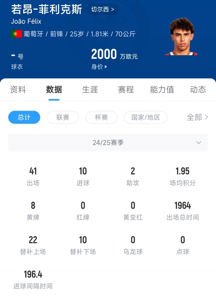 目前25岁的菲利克斯德转身价为2000万欧元,而在19岁时,菲利克斯的最高身价曾达到1亿欧元。